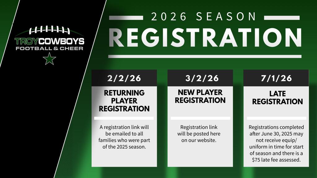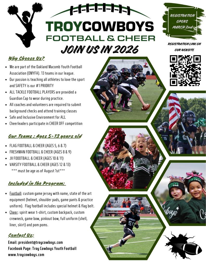 The Troy Cowboys welcome all skill levels of athletes, aged 5-13 (must be 5 as of August 1st), from Troy and any surrounding city.