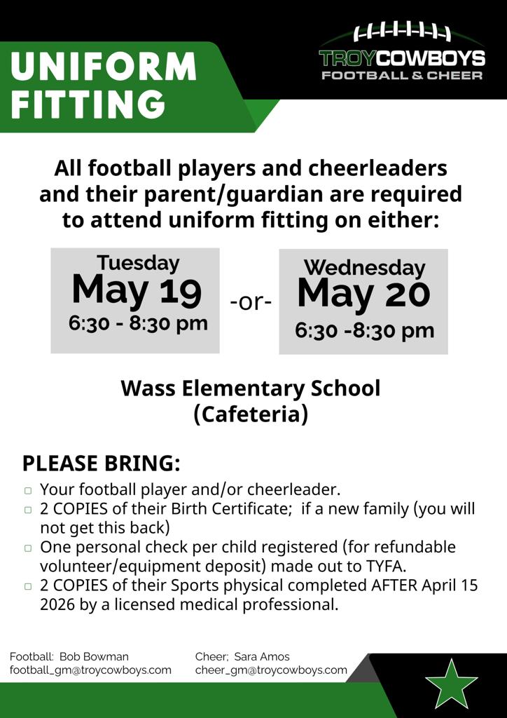 The Troy Youth Football Association, also known as the Troy Cowboys, is an all-volunteer organization that is committed to helping young athletes develop football and cheer skills in a positive and safe environment. We focus on teamwork, integrity, and building confidence. TYFA is a registered 501 (c)3 non-profit organization that has been serving youth athletes since 1956.